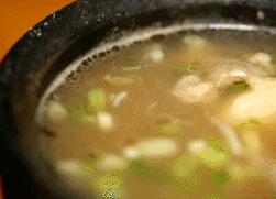 和常见砂锅不同,激油是武陟砂锅的一大特色。滚烫的砂锅刚刚端上桌,里面的汤汁还在剧烈沸腾着。辣椒油泼下的瞬间,伴随着滋啦声香气就腾起了。辣椒段在热油里打着转儿,汤汁也变成了诱人的红色。