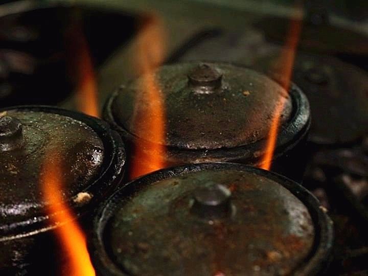 红彤彤的火炉上砂锅正冒着泡