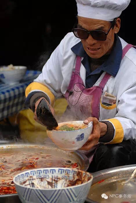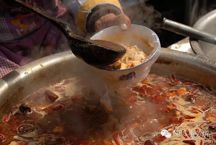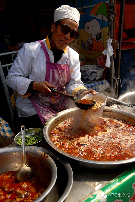 盛在一个有二十多公分的大老碗里,按照传统,那碗还须带着蓝花,是地道的耀州瓷。满满一碗红汤,满得要溢出来,红得像油泼辣子。而且特别地滚烫,与云南的过桥米线差不多。这碗里头有三样食物,一是大肉,大块猪肉,吃起来仿佛坛子肉,酥烂油香;一是疙瘩,有点儿像饺子,有点儿像馄饨的疙瘩,多半是韭菜馅,清素鲜香;一个就是辣子,辣子汤,伴有少量香醋,酸辣咸香。可能你想象不到,这热腾腾、辣兮兮、酸溜溜的大肉辣子疙瘩,却竟然油而不腻,辣而不燥。大概是因了那格外提味的香醋和韭菜的缘故。大老碗,大块肉,大疙瘩,大红辣子汤,只要吃过一回,便会留下深刻印象。