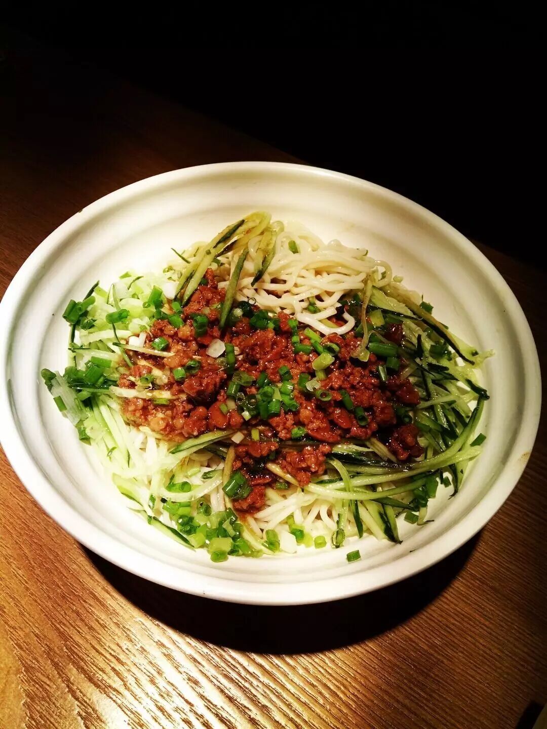 一碗手擀面上满满都是炒制的猪肉末,配上鲜嫩爽口的黄瓜丝,整体色泽红白绿相间,令人食指大动。佳肴入口,猪肉咸香,肉汁丰盈,面条Q弹。