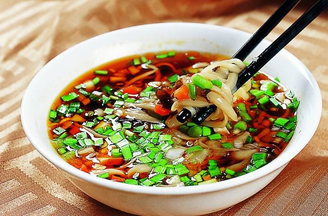 陕西户县的摆汤面有点像过桥米线,但只是看着像。一碗摆汤面的好坏最重要的就是那碗老汤,越是陈年的越好,黑黑的酱油色,上面漂满切碎的韭菜叶。吃时,夹一小箸面条,放入汤里摆一摆,然后再吃,故名“摆汤面”。