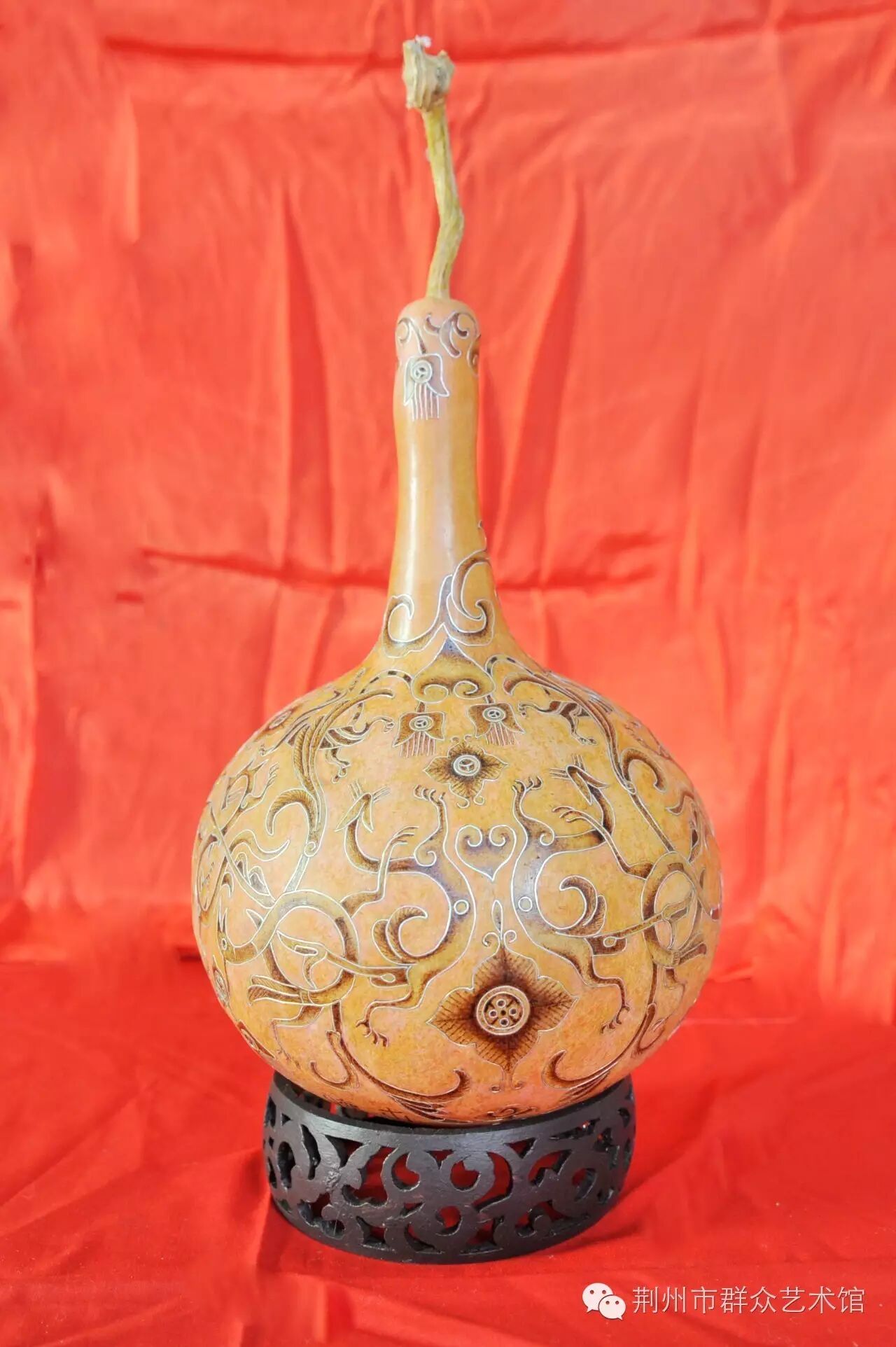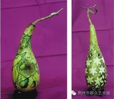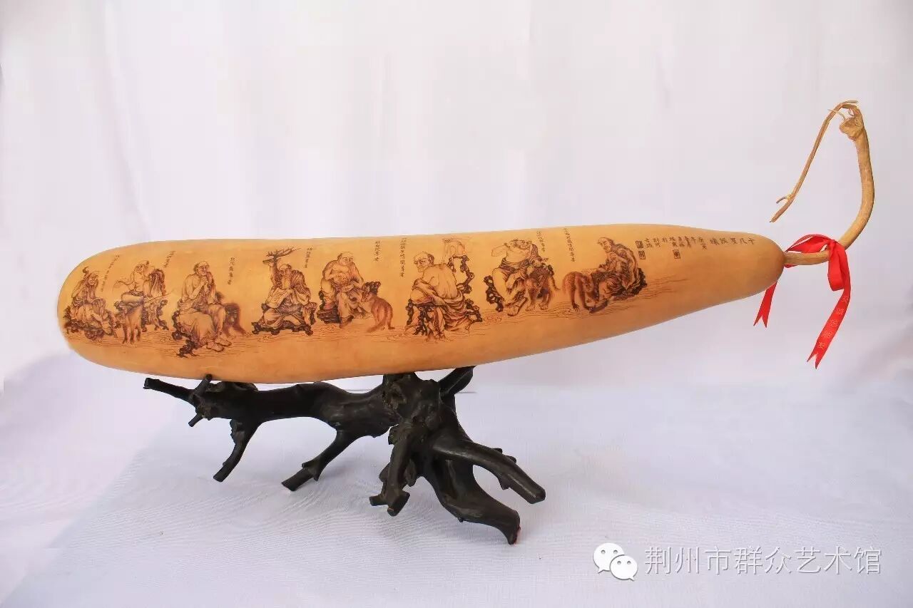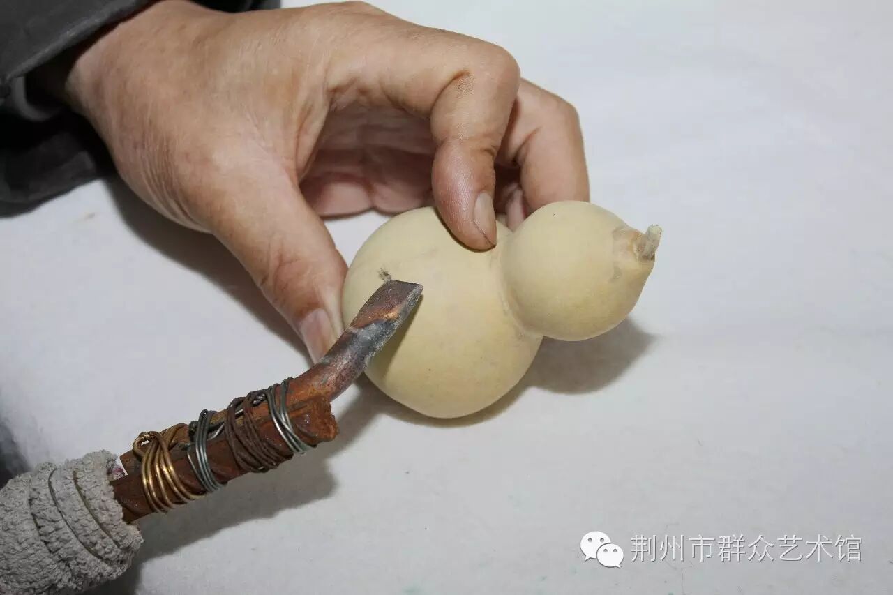 现代古文字学家商承祚《楚匏》一则记载:“二十六年,季襄得匏一,出楚墓,通高约二十八公分,下器高约十公分,截用葫芦之下半。前有斜曲孔六,吹管径约二公分,亦匏质……”湖北江陵凤凰山高台28号汉墓出土的西汉葫芦瓢型彩绘“尹氏”漆勺,现在依然文饰斑斓,色彩绚丽。从这些记载和实用考量葫芦的制作运用已有2000多年,明清时期,荆州的文人雅士多爱玩葫芦,葫芦器制作繁盛一时,出现了镂、烙、镶、勒扎等制作技艺。