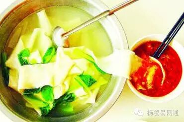 面白薄筋光、油汪蒜辣香、汤面分盆装、越嚼口越香。杨凌蘸水面的面和汤是分开的,吃的时候从大面盆里夹出宽厚且长的面条拉到碗里的汤中,然后夹着面条一口一口地咬着吃。