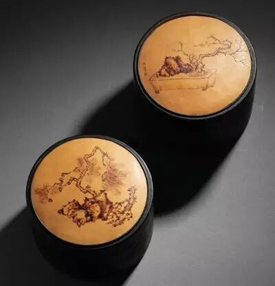 王世襄火绘葫芦片嵌镶红木圆盒成对,《说葫芦》中记载“予有新意,就其平整处,裁切圆片镶在车镟红木盒上,并火画小景。当年所得圆片虽多,成器者仅此一对。”