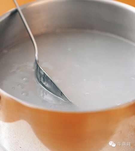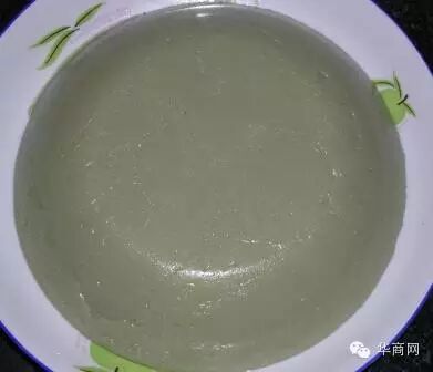 4、煮制过程中应不停用汤勺搅拌,起初速度可稍慢,随着温度的逐渐升高,锅中的绿豆粉浆会由浑浊变透明、由稀疏变粘稠,此时搅拌速度应相对较快,以保证绿豆粉浆的充分均匀。
