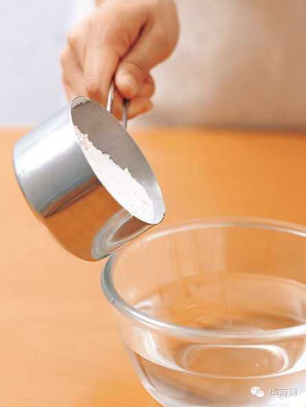 2、再用量杯量出1份绿豆淀粉和1份清水,倒入大碗中搅拌均匀。