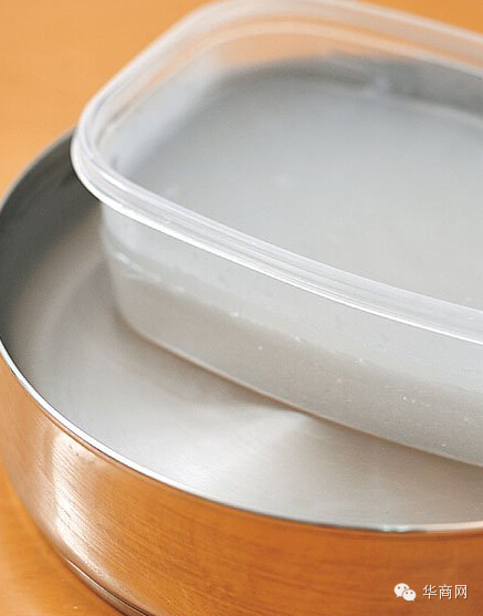 6、将煮好的绿豆粉浆倒入塑料饭盒中,置于冷水中使其自然凝固,或直接放入冰箱中,冷藏数十分钟待其凝固即可。