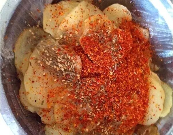 土豆片超级薄,按盆装的,撒上辣椒粉,就可以开造了。