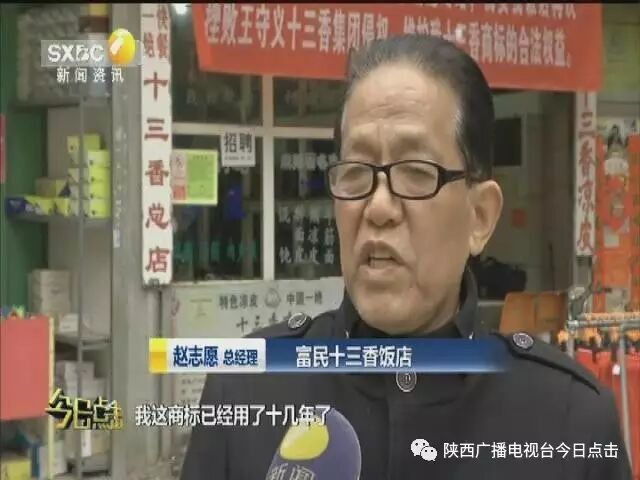 据赵志愿介绍,早在2000年4月,他就以富民十三香饭店的名义注册了十三香商标,用于面皮,肉夹馍等小吃的制作销售,十多年来,一直都在使用,从未间断。但是,面对王守义十三香这样一个年销售额十几亿元的大企业,老赵有点不知如何应对。