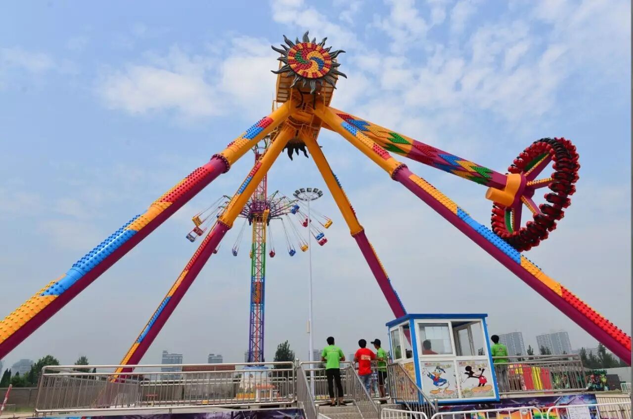 来自欧洲的“太空舱”,融惊险性、趣味性于一体,乘坐其中,时而冲上浪峰,时而跌入深谷,巨大加速产生的失重感,让人恍如穿越在太空船舱;带来全新高空刺激的“高空飞翔”,则让游客在40米升降的同时,体验“高空甩开120度夹角的高速旋转”……