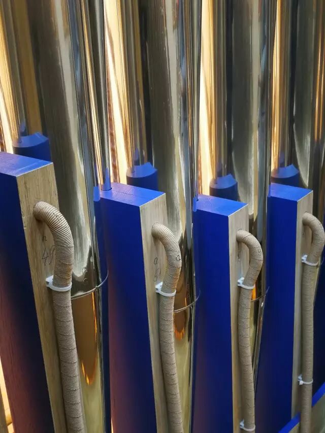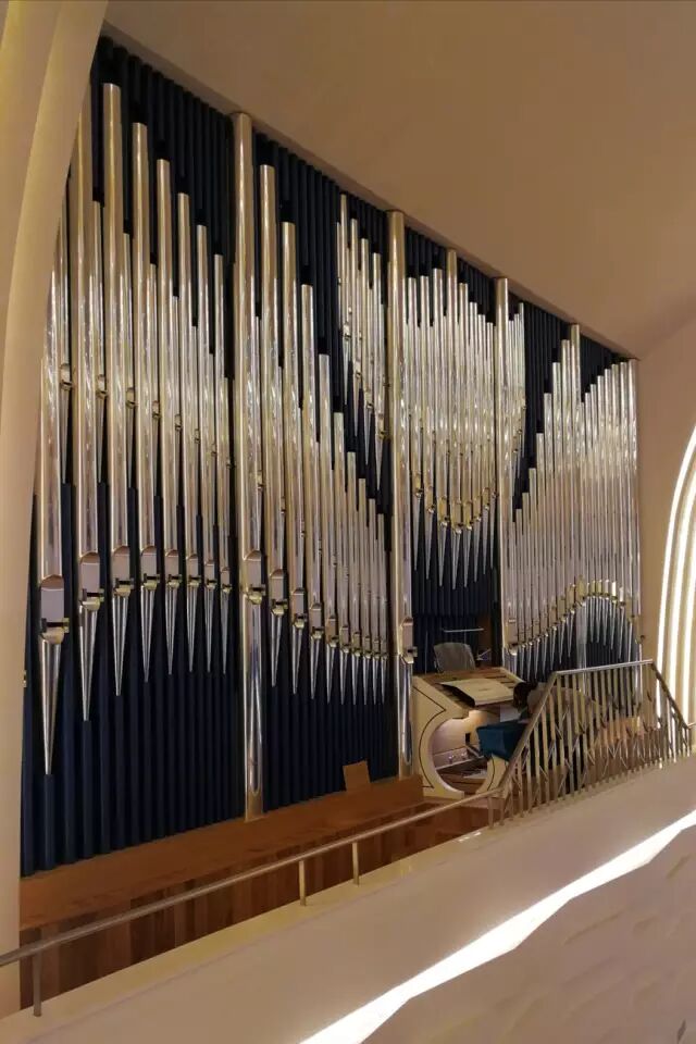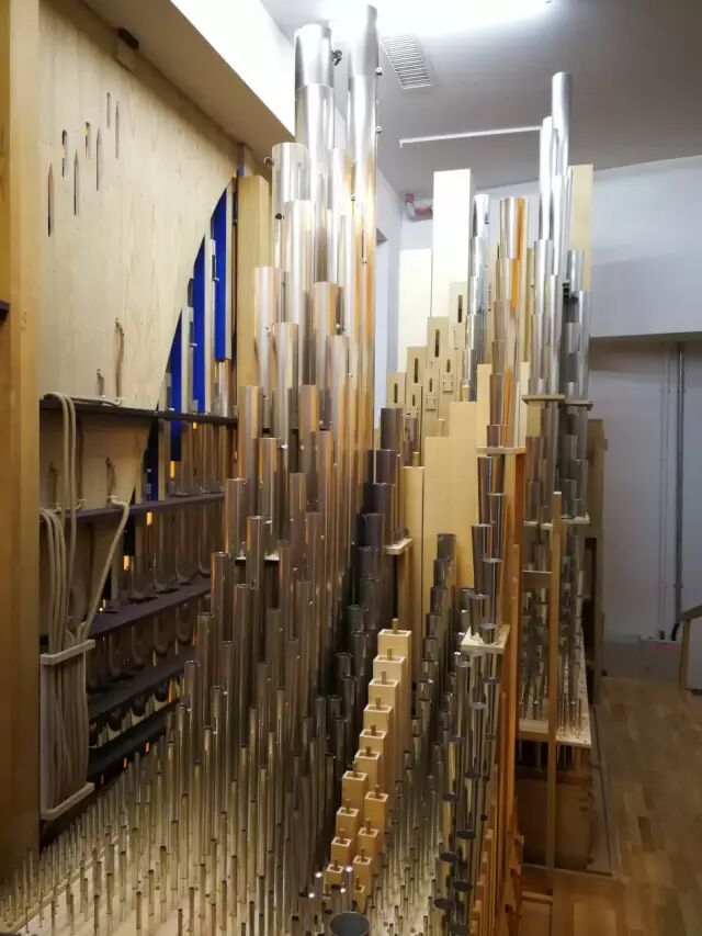 在音乐厅看到的管子只是满足装饰效果的很少的一部分,更多的管子都藏在后面的房间内。因此音乐厅看到的管风琴墙面都是通透的,以便后面房间内的管子发出的声音能够传入音乐厅内。