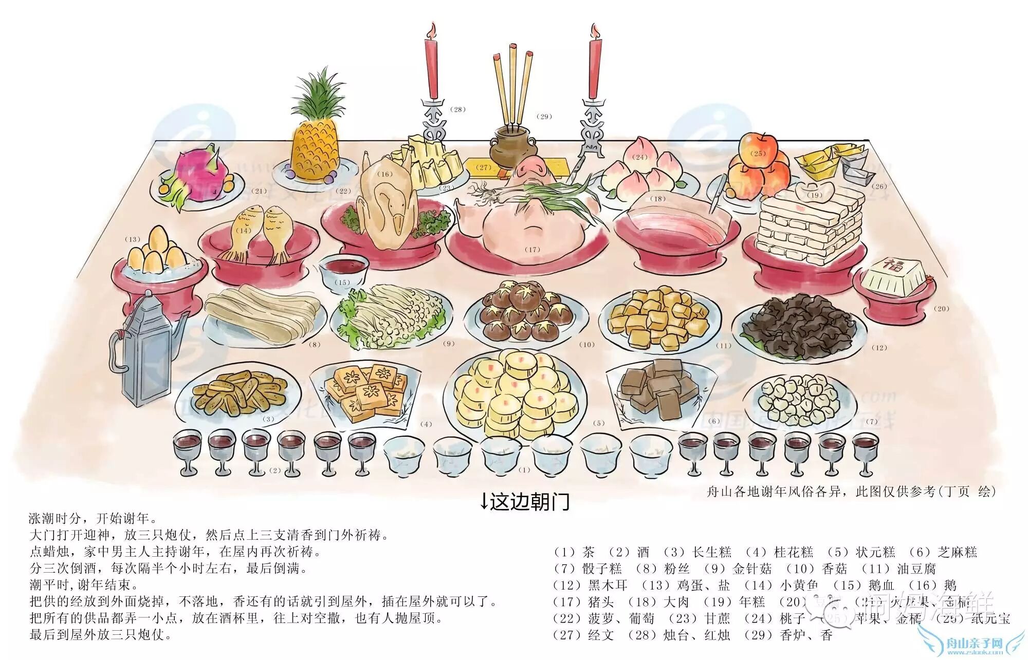 鱼(要带鱼鳞),舟山人一般用黄鱼,现在野生的没有,多用养殖的。鱼头和猪头的方向相反,朝屋里,意为鱼要从大门游进来,年年有余;