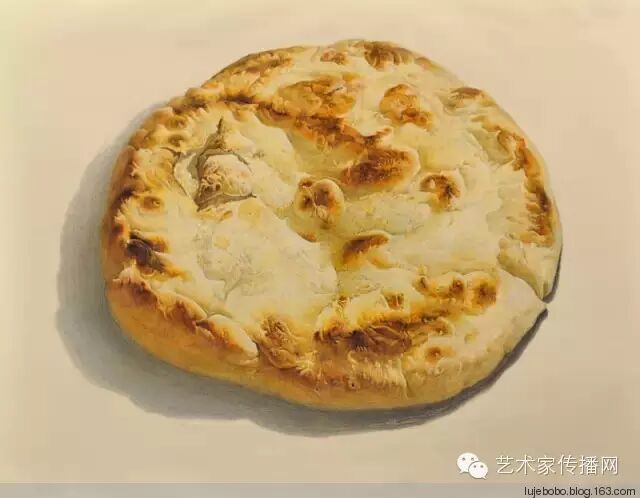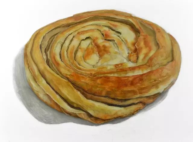 作者是个地道的甘肃敦煌男孩,描绘的静物是作者用家乡的烙饼工艺自制的美食,敦煌锅盔是极具西北地区饮食面貌的食物。