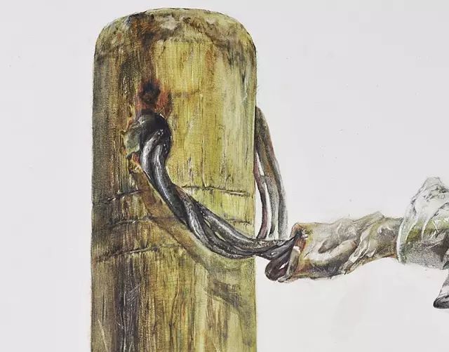 是这几届作品中画动物类表现较好的作品!开始学生只是选择常见的生活用锁、锁链、锁心等,画出来的小稿无动人之处。调整思路后找到了创作的角度,画面中用绳子、铁丝缠住标本,充分地体现了主题。