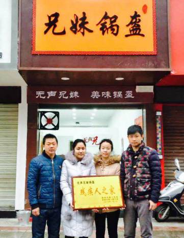 2017年1月10日,湖北省荆州市洪湖市文化广场工会门前,一间写有由聋人开办的《兄妹锅盔店》开业了。