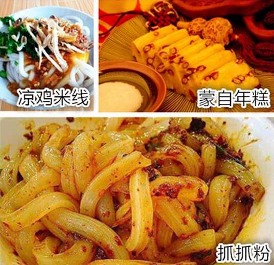 过桥米线、青头菌、云南臭豆腐、豆花米线、凉米线、罐罐臭豆腐、罐罐鸡、腌菜包、卤腐(腐乳)、宝珠梨、卤鸭子小白鱼、海榨、宜良烤鸭、松茸、火焰土豆泥、鸡、摩登粑粑、凉鸡米线、卤饵丝、包浆豆腐、鬼鸡、滚锅牛肉……