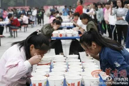 ,参加比赛的有学生、有老师,也有社会人士。比赛要求吃面的同时也可以喝汤,但是面条必须吃完。比赛现场,加油声,笑声不断。经过激烈角逐,最终33岁的李都都以65秒吃了15碗面的成绩,获得大胃王咥面冠军。