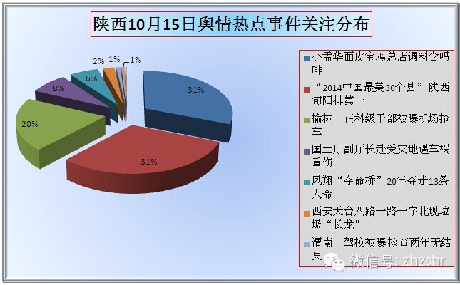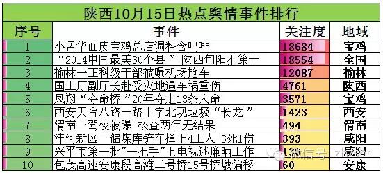 综合今日舆情数据,根据华商监测结果显示,今日陕西省舆情热度最高的事件是“小孟华面皮宝鸡总店调料含吗啡”,截至今日15时,相关话题位居今日舆情热点排行第一位。“‘2014中国最美30县’陕西旬阳排第十”、“榆林一正科级干部被曝机场抢车”分别位居今日舆情热点排行第二、三位。