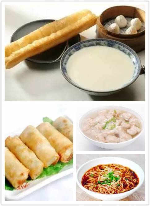 小面、刀削面、铺盖面、米线、米粉、抄手、油茶、豆浆、油条、糍粑块、麻圆、春卷、油炸糯米饺、锅贴、锅贴饺子、包子、馒头、糯米团子、三角粑、熨斗糕、韭菜饺子、汤圆、葱油饼、锅盔、烧饼、土家饼、白糕、糍粑、蛋饼、手抓饼、山东煎饼、芝麻糊……