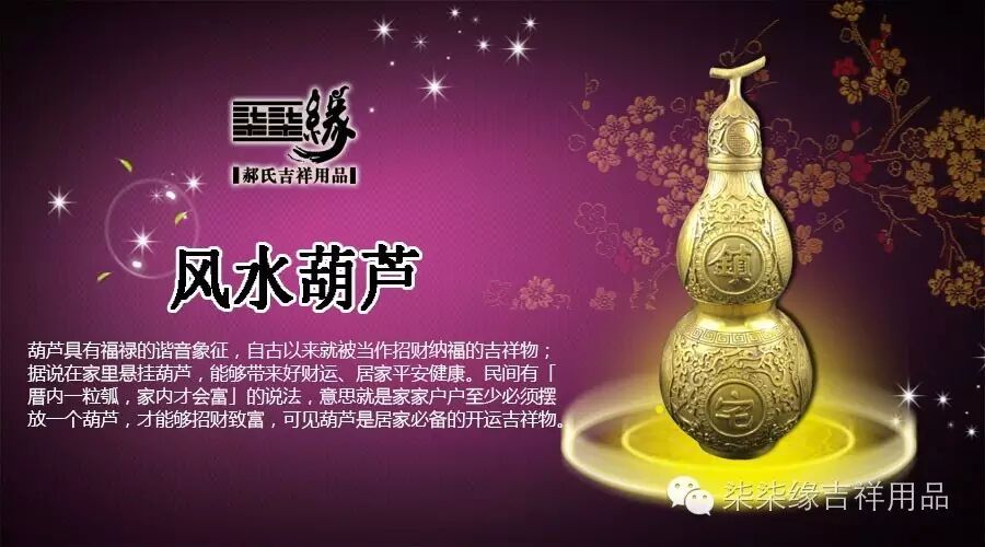 四、 可以化煞挡煞。用一只或三只葫芦悬挂于外部形煞所冲之方即可。一定要开光后方能使用,而且要择吉日吉时,否则无效。葫芦是可用作除病之用,只须挂在病者的睡床前或摆放在病者的睡侧。葫芦挂在大门外,则有保屋内人平安的作用。葫芦可采用天然葫芦瓜晒干成品或铜制葫芦。但要注意铜器并不一定适合每个人,要视乎你的五行。