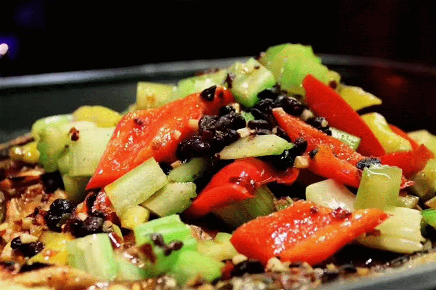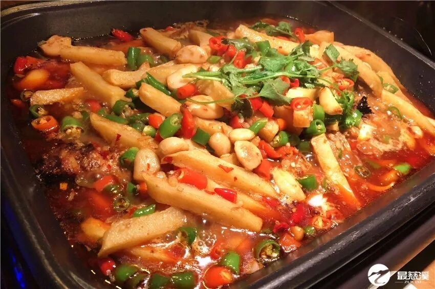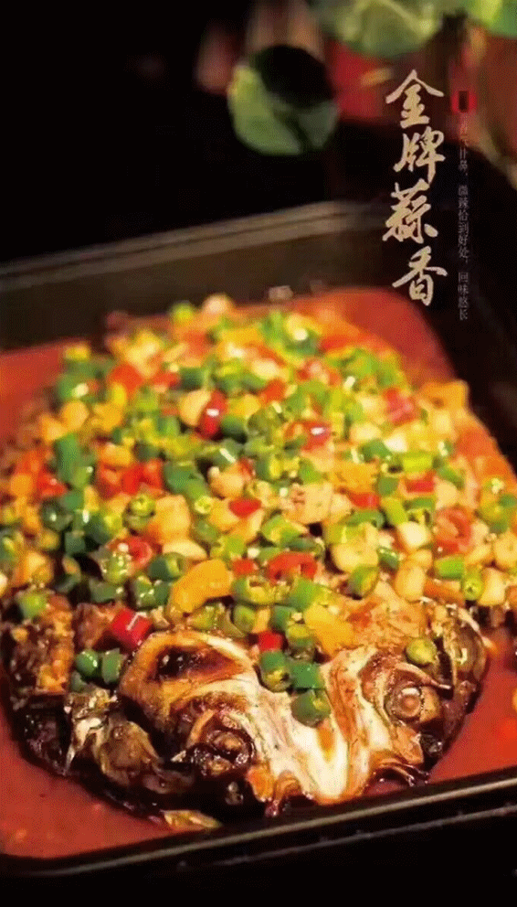 金牌蒜香烤鱼,一端上桌就香味扑鼻,浓浓的蒜香混着鱼肉的鲜香。新鲜十足的清江鱼上面铺满了绵软入味的炸土豆条,青红辣椒点缀其中,汤汁浓稠。