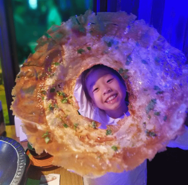 这个小鱼大锅盔,咔嚓咔嚓咔嚓超级酥脆,还浇上了一层神秘酱汁,咸咸的,非常香。造型也是相当粗犷了,快来比一比,看看锅盔的洞大还是你的脸大。