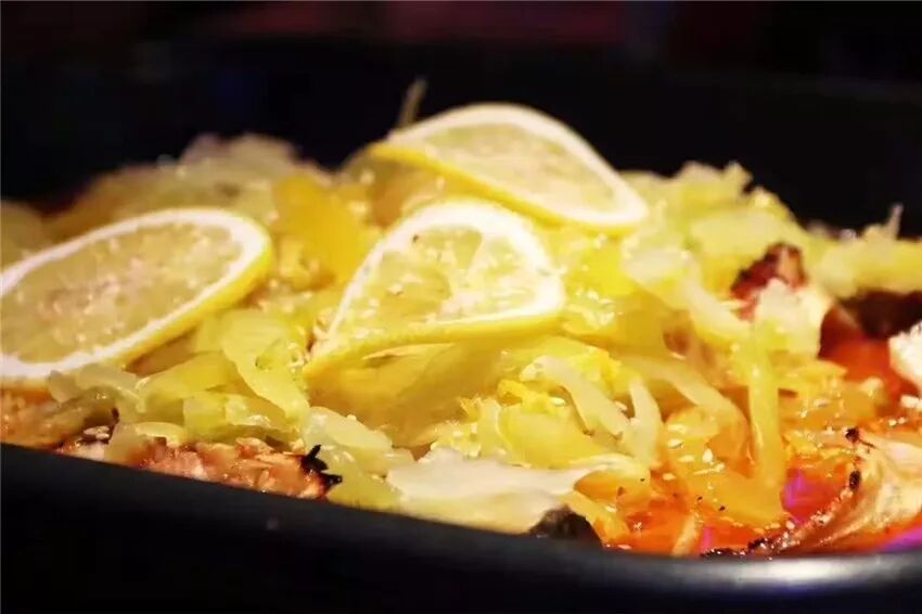 黄金酸辣烤鱼一登场就让人离不开视线,黄澄澄的一大盘,居然还放了新鲜柠檬片。翻开厚厚一层潮汕酸菜,扯下一块喷香鱼肉,再加一块鱼豆腐,妙哉妙哉。