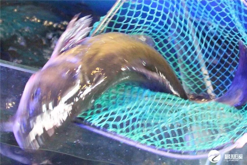 鱼有多新鲜?老板抄起渔网捞起一条大鱼。不好意思,鱼太活泼,喜欢蹦跶,照片都糊了。