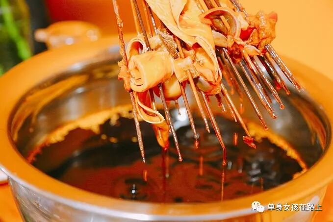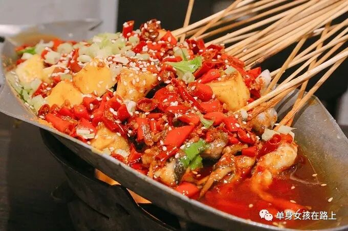 他们家的串串有两种风格,我便都尝试了一下,上图是比较传统的串串,一把拿出都在滴油,下图是像烤鱼一样的,下面还有一个大铁锅在烧。两种味道都很棒,不过我个人更倾向于下面的,毕竟上面的浸泡在红油中,实在是太烫啦!!油一封热气就散不出去了,三十多度的天火热火热的。