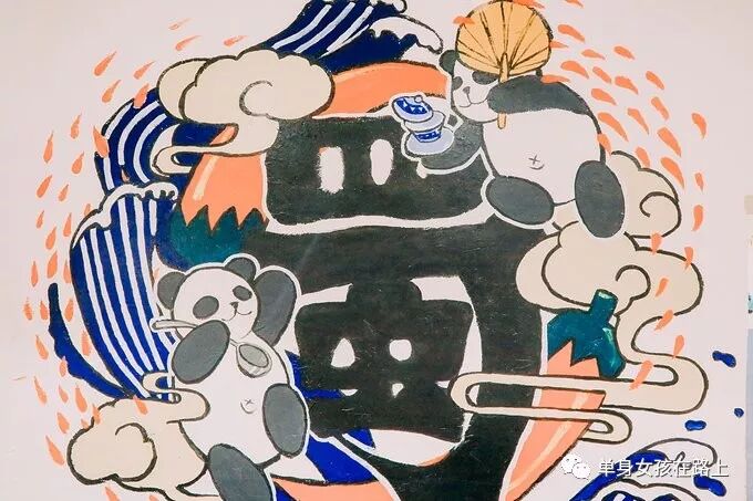 饭吃到一半,仅靠着这面墙的那桌人吃完走了,服务员还在收拾,我一看终于没有人头挡着我了,赶紧拍照啊。筷子一丢,拿着相机就冲了过去。我感觉周围桌子的人和服务员都是一脸惊呆的看着我。没办法,职业本能啊,我本就是画画的,对这些墙绘就感兴趣,现在又是个拍照的,自然不能放过啊!!!!