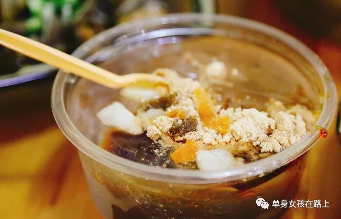 不过在跑了一天之后,留了那么多汗后还是冰粉最爽。这家的冰粉是真正放了红糖而不是红糖水,所以需要自己搅拌均匀,不然不均匀会造成上面没味道下面太甜了。最后放进冬瓜糖、山楂、葡萄干最后再撒一把黄豆粉就好啦。