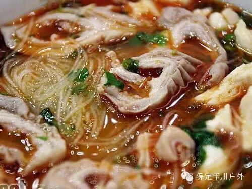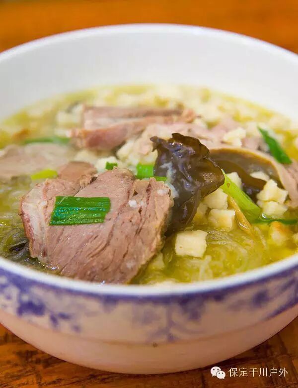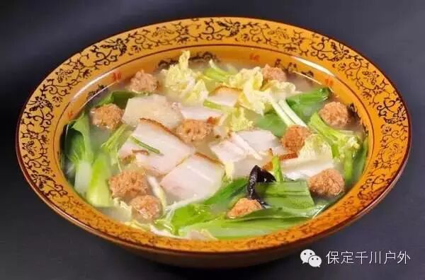 陕西风味的汤菜,食材非常丰富。三鲜是指响皮、五花肉片、猪肉丸子。再配以木耳、青菜、油豆腐、香菜等辅料, 在特制的高汤中用烩的方法烹制,再加入简单的调料调味即成。汤汁浓厚洁白,非常鲜美喝一口,唇齿留香,回味无穷。