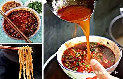 陕西八大怪中,biangbiang面就占了三个:其一,面条像裤带。其二,盛面的碗一般都非常大,盆碗分不开。其三吃面的标准姿势是蹲在凳子上,就有了凳子不坐蹲起来。