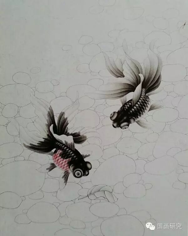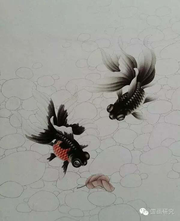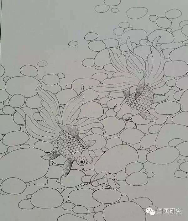 用中墨勾出金鱼整体结构及水中卵石,宜用中锋勾线。先勾金鱼勾勾卵石,行笔要生动灵活,线条要自然流畅,勾出金鱼长尾在水中飘柔的质感。
