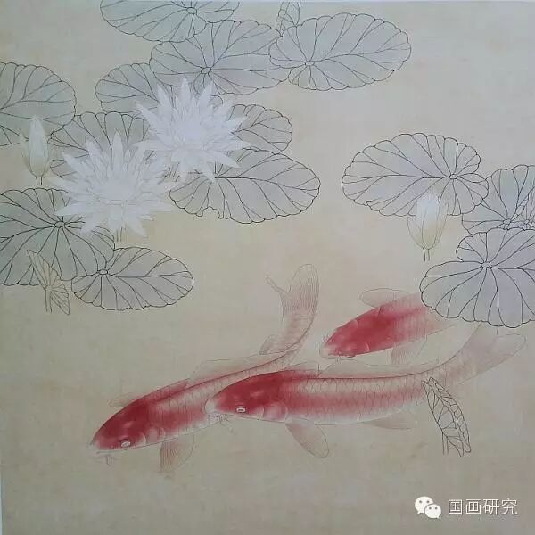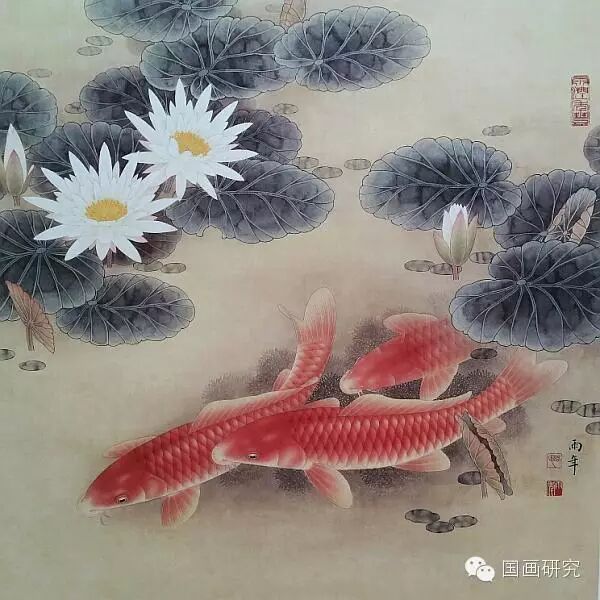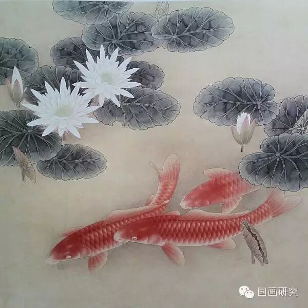 用藤黄罩染鱼头、鱼体,腹部留白。深红分染睡莲叶子,藤黄加白粉和少许朱磦点花蕊。用墨加少许花青染鱼的周围,中墨和浅墨分染勾鱼周围水草,花青加墨点浮萍。整理,落款,盖章。