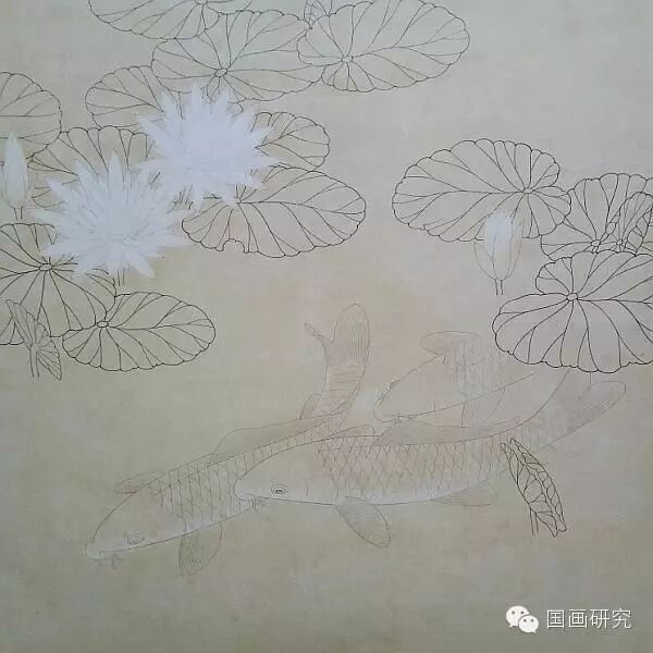 用重墨勾睡莲叶子,浅墨勾睡莲花瓣,淡墨勾鱼头部及鱼鳞、鱼鳍。用赭石加藤黄加墨调成土黄色,用排笔刷整个画面,趁底色没干用清水笔洗净底色,留出睡莲花。