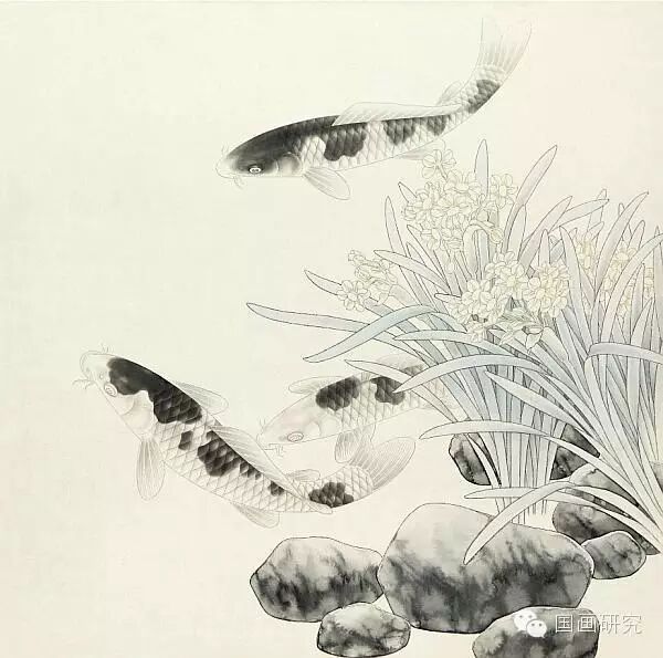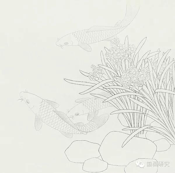 中墨勾鱼体及水仙花瓣,深墨勾水仙叶及石头。用笔要生动灵活,线条自然流畅,经久耐看,不可一览无余,要勾出物体的质感。
