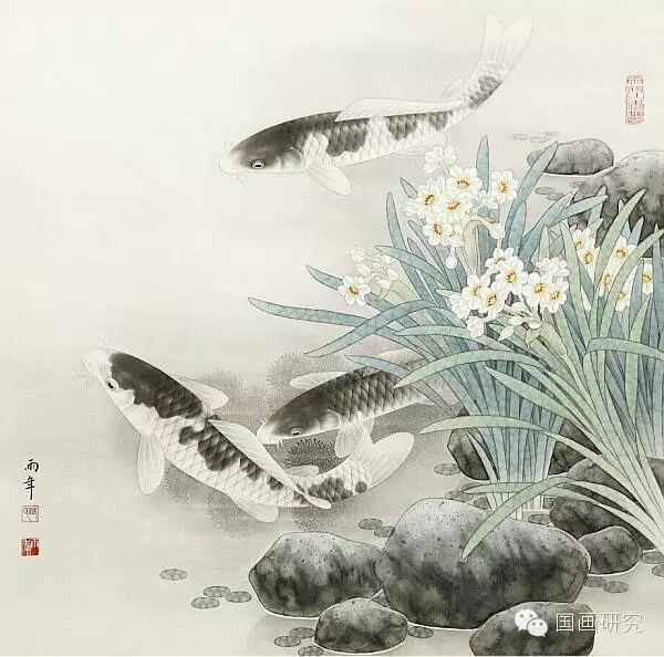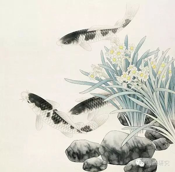 用墨再分染鱼头、鱼鳞及鱼体各部,逐步加深,花青、藤黄分染水仙叶的正、反面。藤黄罩染水仙花托盘。花青分染石头上部,赭石分染石头下部。