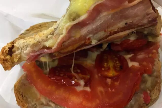 口感:其中夹层的奶酪应该是羊奶酪,味道很重很重,属于喜欢的小伙伴会爱死,不喜欢的看到就不能忍的程度。不过用料真的很扎实,一口咬下能吃到新鲜的番茄、培根、芝士还有蔬菜。