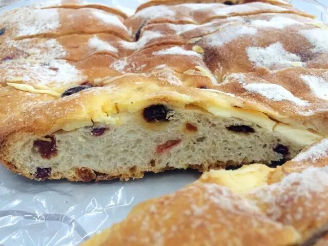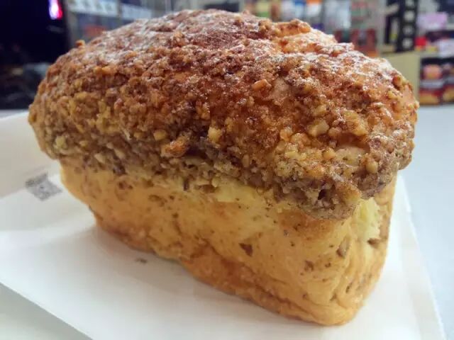 口感:顶部的糖霜和核桃一定要一口咬下,那股甜蜜的劲儿简直了!整个面包偏松软,有点千层酥的柔软版本。里面的淡奶油夹心水水润润的,综合了整个面包干涩的口感。