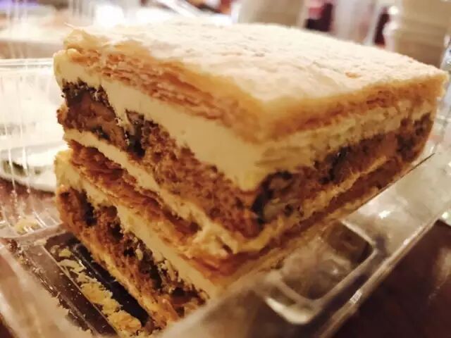 口感:,制作工序是比较复杂的,“一千层酥皮”可不只是书面上的解释。,酥皮间的奶油松榛夹心稍微用力一压就四下溢出,口感很棒。