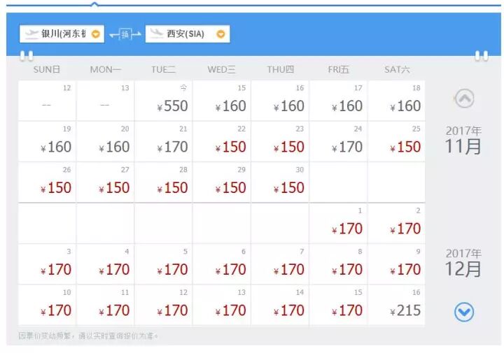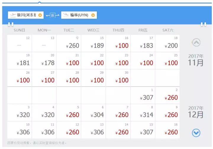 11月底至12月中旬,银川至北京的机票价格低至200元左右!比火车卧铺还便宜~