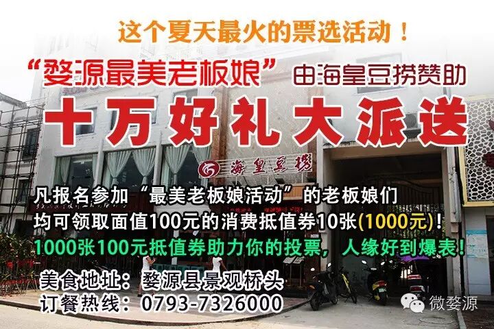 排名前三名的进入决赛,恭喜你们啦!以上10位美女老板娘每人均可获得海皇豆捞100抵值券10张(可抵1000元消费),领取地址:婺源县景观桥头;咨询电话:0793-7326000