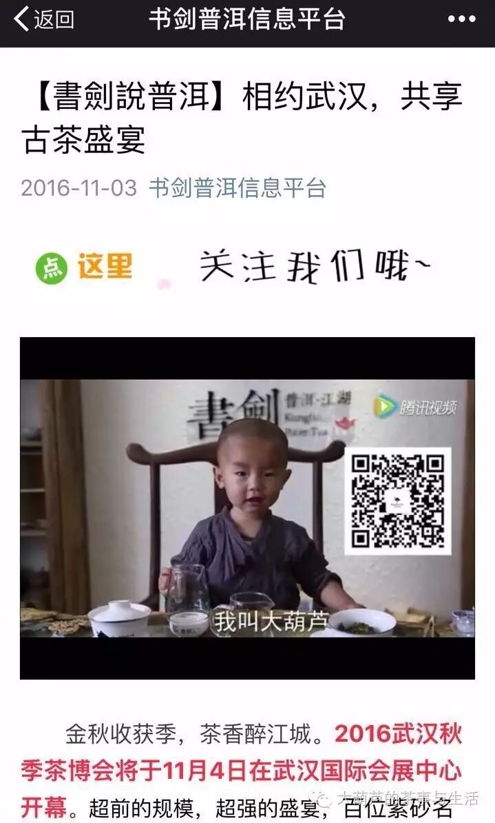 大葫芦的成长记录也同书剑古茶的年鉴代表作“书剑号”寓意一样,每个人每一年都有自己的变化与成长,每一年大葫芦都在书剑古茶的茶博会上留下自己的故事,让大葫芦最纯真的笑容唤醒不变的记忆!让时光在茶与水的邂逅,你与我的相识相知里感动、温暖!