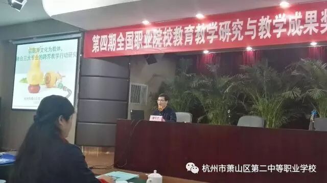 2017年4月10日下午,在杭州金苑宾馆,萧山二职党委委员廖平才老师应中国职业技术教育学会的邀请,就我校2016年浙江省政府成果奖一等奖成果《以葫芦文化为载体,融合三大专业的跨界教学实践研究》,向全国职业院校教育教学研究与教学成果奖申报工作高级培训班的学员们做了成果推荐。