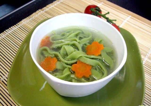 绿色面条主要是蔬菜汁的成分,和面的时候加入蔬菜汁,就会变成这种颜色,清新的样子让食客很有食欲。