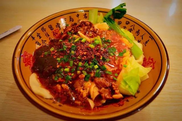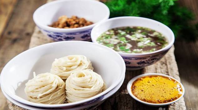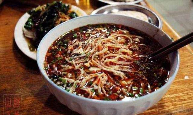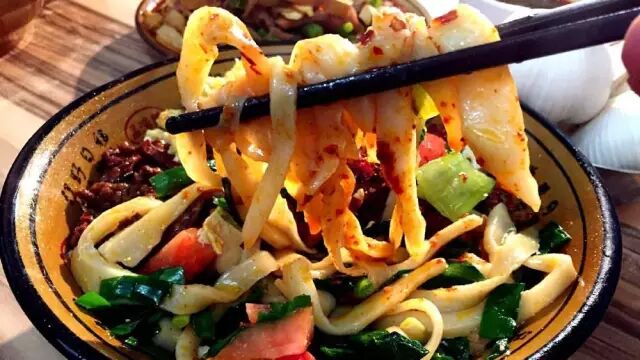 很多外地人说到西安一定要吃碗biangbiang面,陕西八大怪中,biangbiang面就占了三个:面条像裤带,盛面的碗一般都非常大,所以盆碗分不开。吃面的标准姿势是蹲在凳子上,就有了凳子不坐蹲起来。之所以叫biangbiang面,是因为在做面的过程面条和案板接触,发出biang、biang的声音而得名。biangbiang面还有另一种揪面片的吃法。