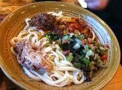 礼泉的烙面据说是世界上最早的方便面,荞面和白面烙成薄饼,晾干之后切成丝。吃的时候用热水一焯,然后再用高汤直接浇到切好的烙面上,加上肉沫、韭菜、油辣子,就可以吃了。