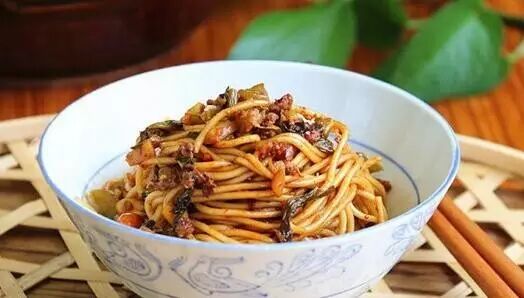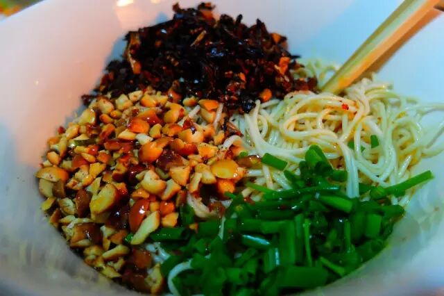 脆香的芝麻花生,咸中带甜的宜宾碎米芽菜,红通通的红油辣椒,还有香醋、酱油、芝麻……一层盖着一层,吃一筷子,咸鲜爽辣,唇齿留香。