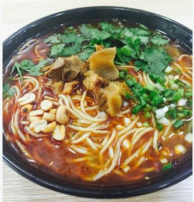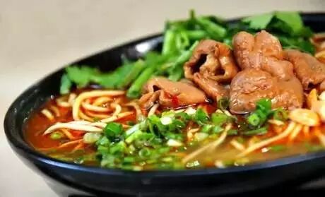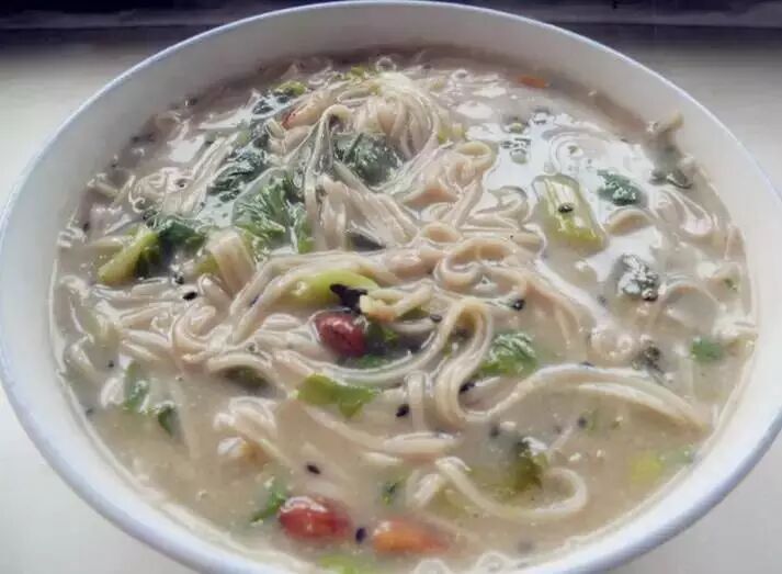 说了那么多外来面食,不得不提的还有咱们本地特色的芝麻叶粉浆面条。每次逛街时,都要到钟楼那儿去吃上一碗粉浆面条。劲道醇香的黑芝麻叶提前加工好,上好的豆打磨成浆,面条擀得宽窄如一,再挖上一勺提前腌制好的的黄豆和芹菜粒。更绝的是老板还会淋上一小勺本地的特产芝麻酱,喜欢吃辣的再来上一勺辣椒油。虽然看着其貌不扬,却是咱驻马店人割舍不下的滋味。